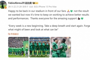 體育資訊3月22日訊 國安外援法比奧更新社媒,談到了本輪主場1-1戰(zhàn)平申花的感受。