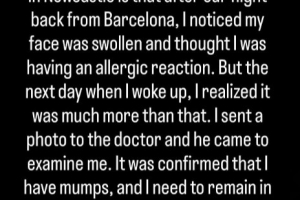“我把照片發(fā)給醫(yī)生,他過來對我進行了檢查。結(jié)果證實我患有腮腺炎,需要隔離5天,并在更長時間內(nèi)停止體力活動。我現(xiàn)在專注于康復,爭取盡快恢復到100%的狀態(tài)?!?/p>