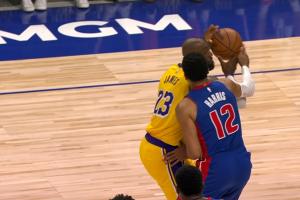 GIF-詹姆斯轉身跳投被吹犯規(guī) 活塞挑戰(zhàn) 變?yōu)椴环敢?guī)且詹姆斯出界