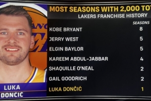 東契奇29投11中,三分球13中3,8罰7中得到32分7板6助3斷。算上這32分,他賽季總得分2005分,是湖人隊(duì)史第七位單賽季得分突破2000的球員。