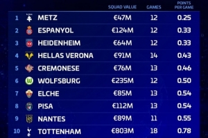 體育資訊3月24日訊 德國轉(zhuǎn)會市場統(tǒng)計了2026年五大聯(lián)賽球隊場均積分最低的Top10,法甲的梅斯0.25分最少。